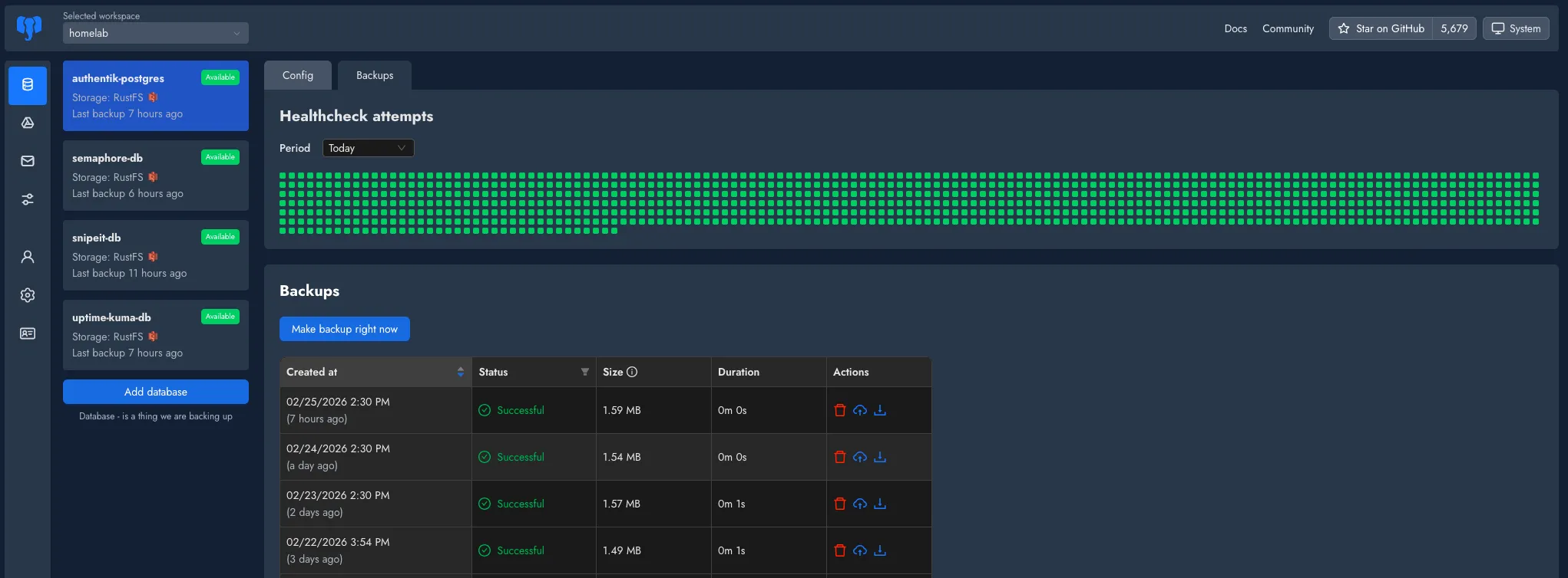 - Databasus + RustFS handle database backups across the homelab. Databasus takes the dumps; RustFS stores them.