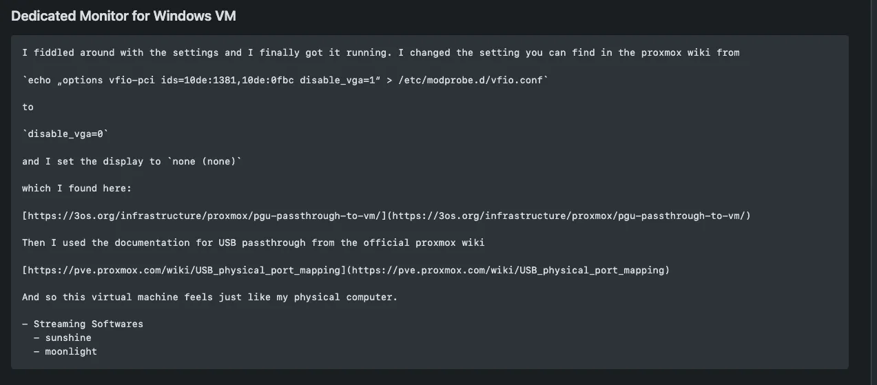 The GTX 1650 Super is passed through to the Windows VM, along with the USB ports, so I can plug in a keyboard and mouse directly. I found a community config that lets me use an HDMI or DisplayPort cable straight from the GPU to my monitor instead of relying on RDP, so it works and feels just like a regular desktop. It handles smaller games efficiently, which is all I need.