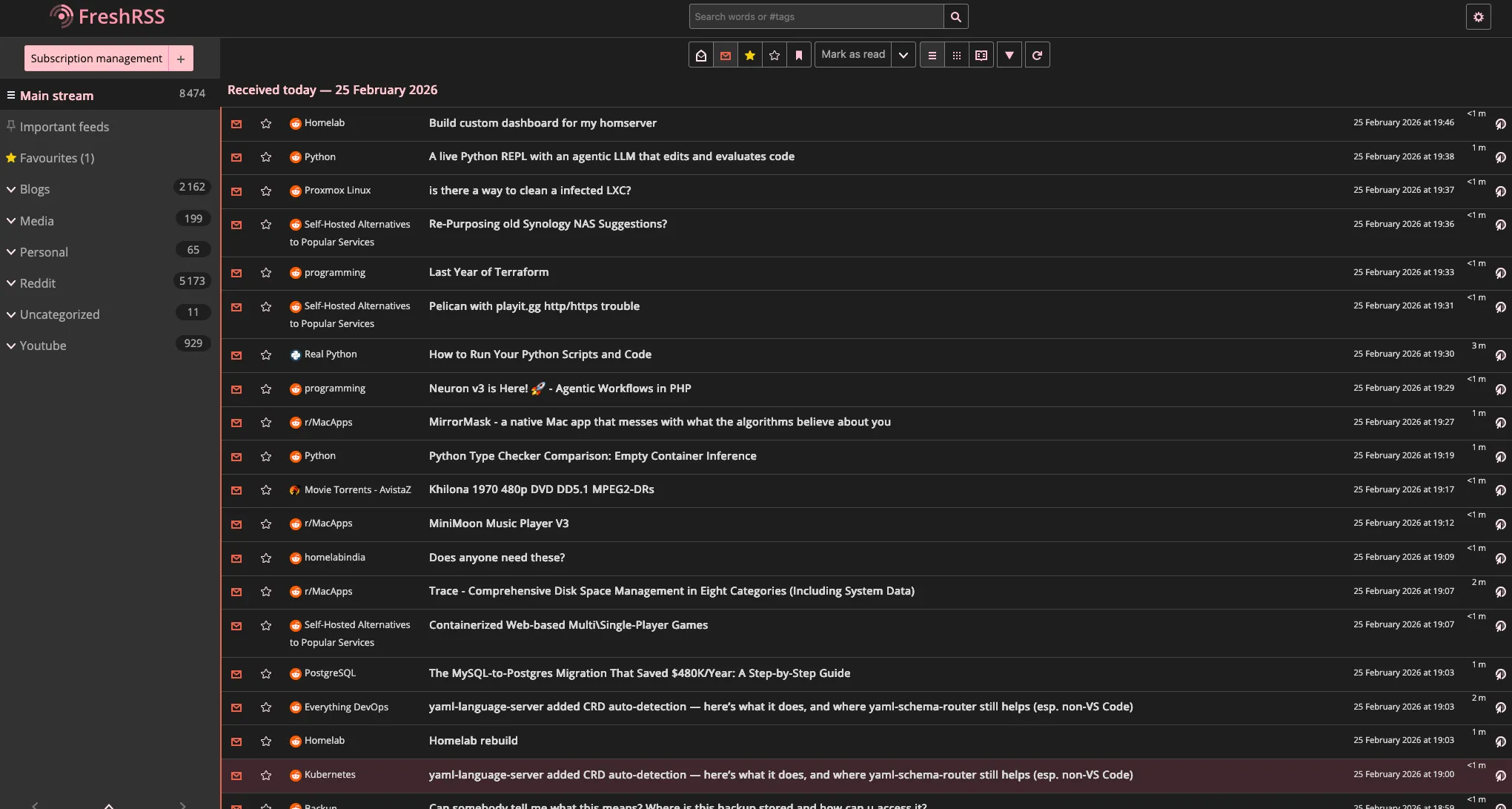 - FreshRSS + FiveFilters is my RSS solution for blogs, newsletters, and video updates. I read everything through Reeder on iOS.