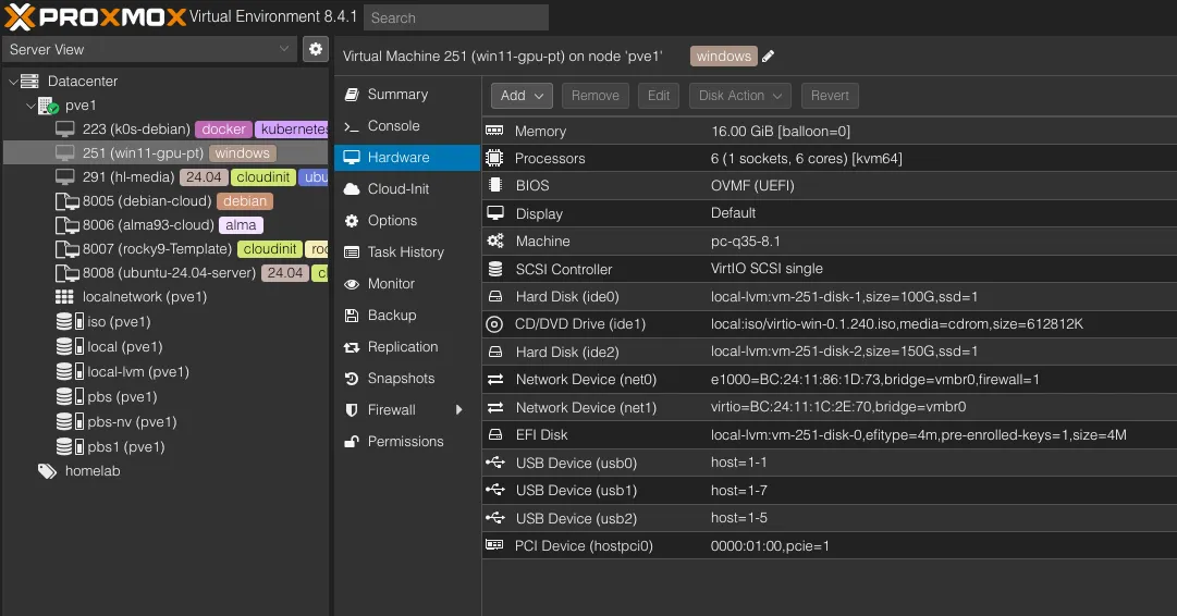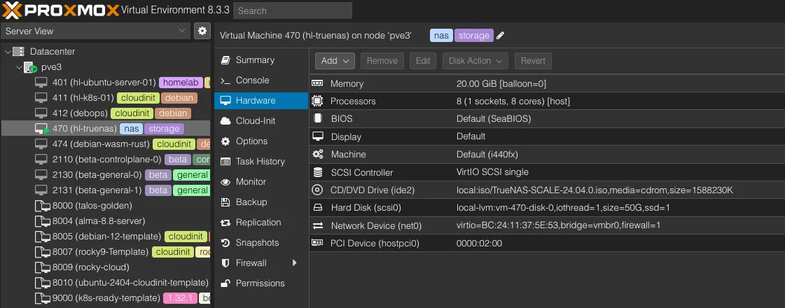 The SATA PCI controller is passed directly to the HL-TrueNAS VM, which has 2TB and 10TB disks attached for storing large datasets. TrueNAS gets full control over the drives, while Proxmox manages everything else. I’ll cover what runs on HL-TrueNAS in detail in the NAS section below.
