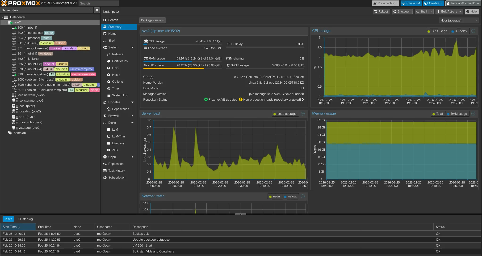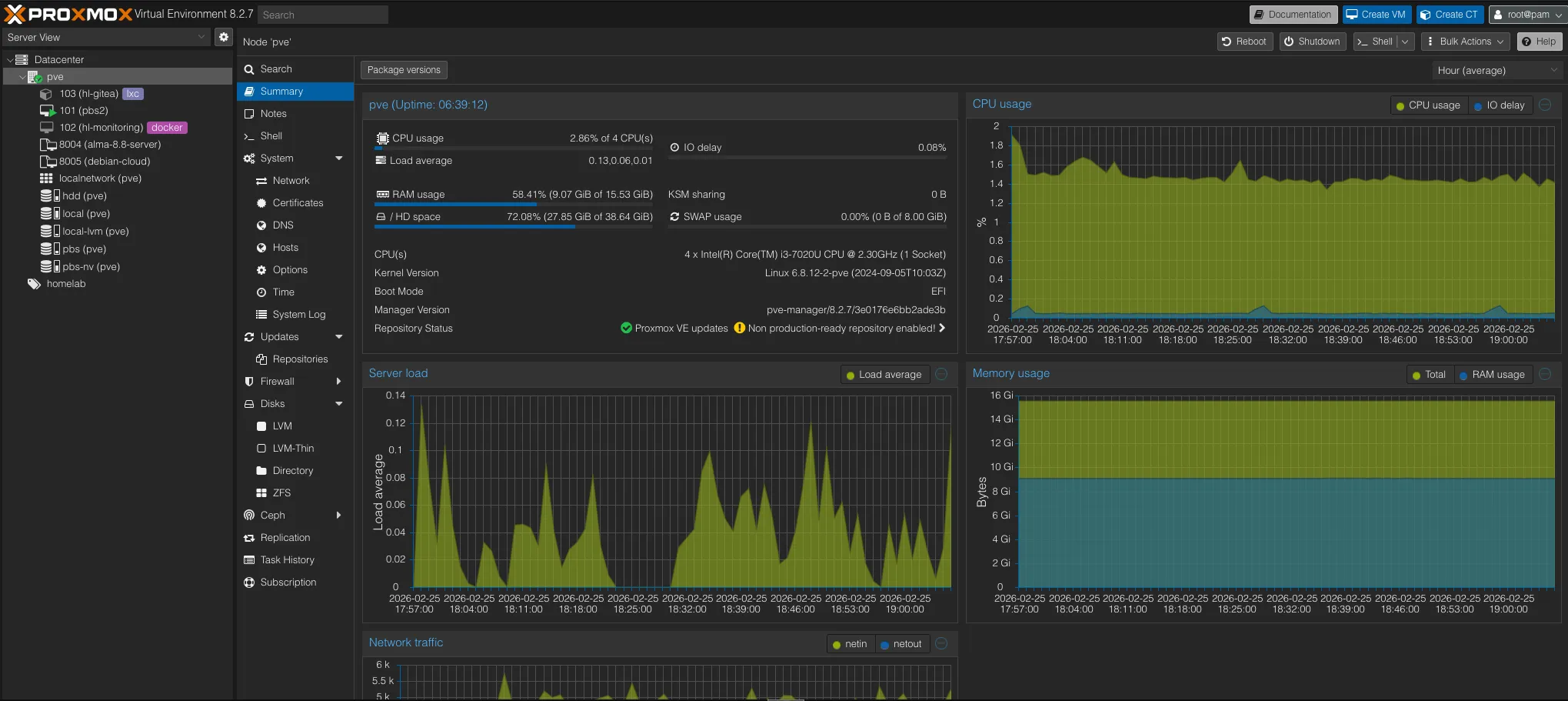 This is a new addition to my homelab: a lightweight but powerful ASUS PL64 with a 12th gen i5, 32GB RAM, 500GB storage, and multiple NICs. The 12th gen CPU with Quick Sync makes it perfect for media transcoding — exactly why I run Jellyfin here.