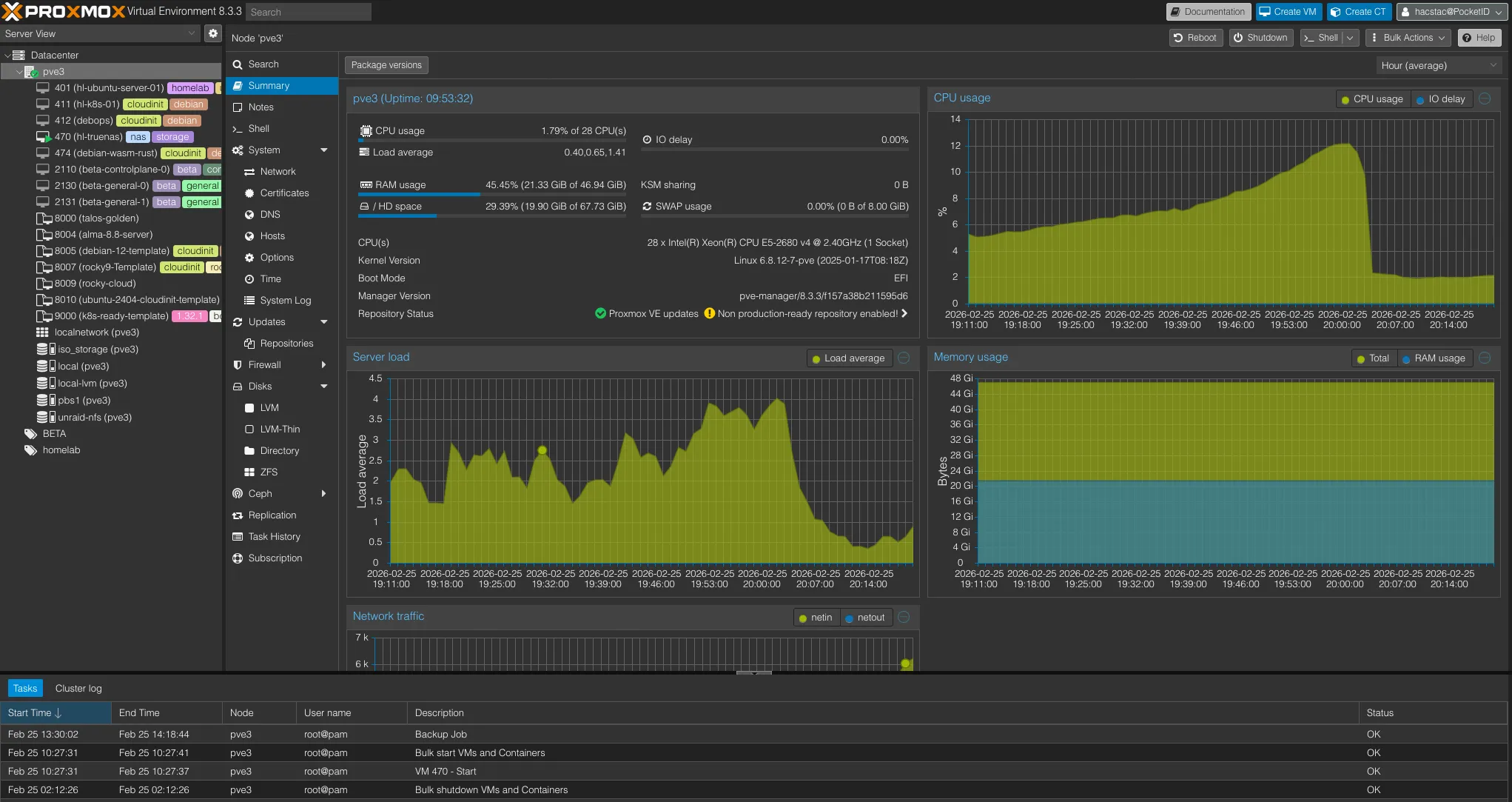 This node runs a 3-node Talos cluster for testing heavy-duty workloads. It’s separate from the K8s cluster on pve2 and is purpose-built for experimenting with Talos Linux as the immutable OS layer.