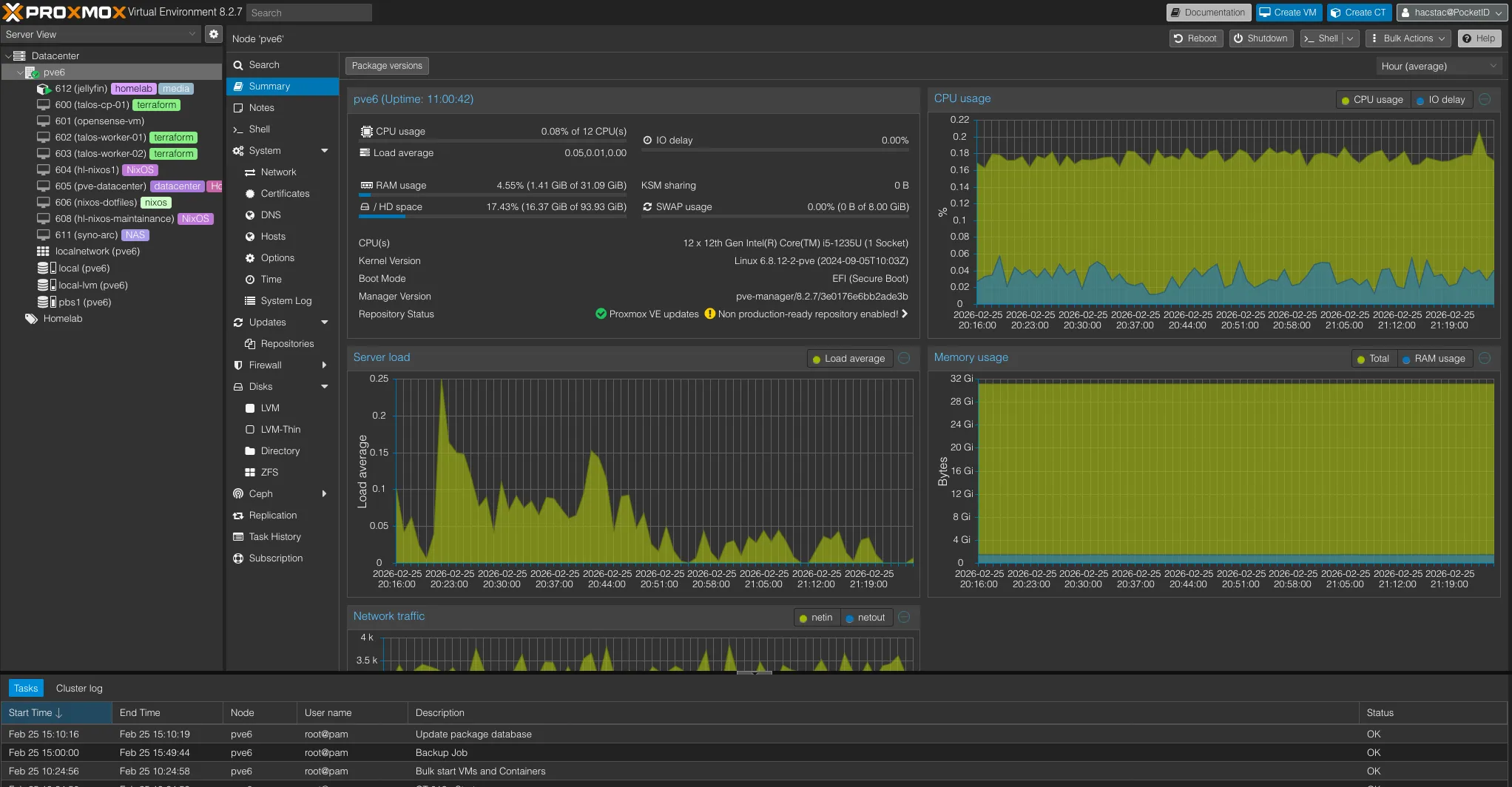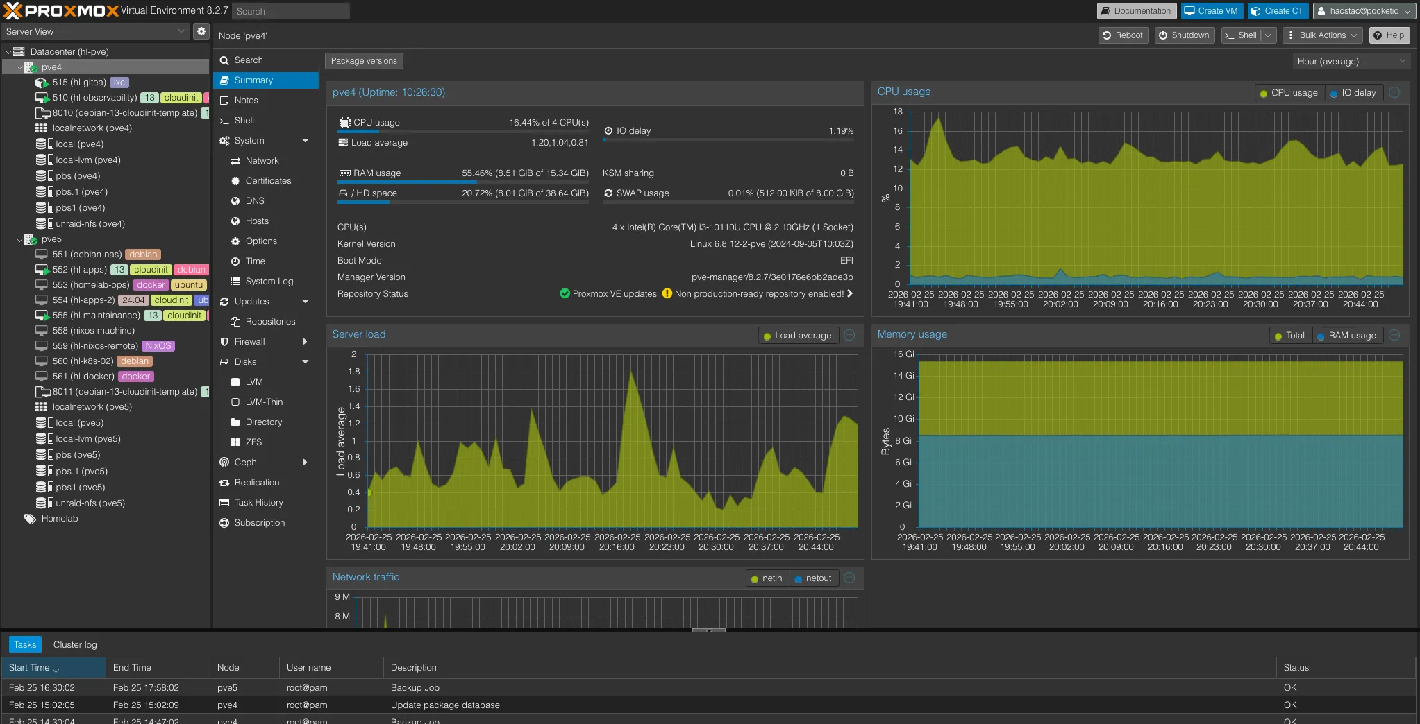 hl-observability is where all my homelab telemetry lands. Every machine in the lab runs an OpenTelemetry collector and Fluent Bit agent that ship data to Kafka (running on hl-maintenance on pve5). From there, dedicated OTel and Fluent Bit consumers pull from Kafka and push metrics into VictoriaMetrics and logs into VictoriaLogs for long-term retention. I’ll cover the full pipeline and stack breakdown in Part 3’s Observability section.