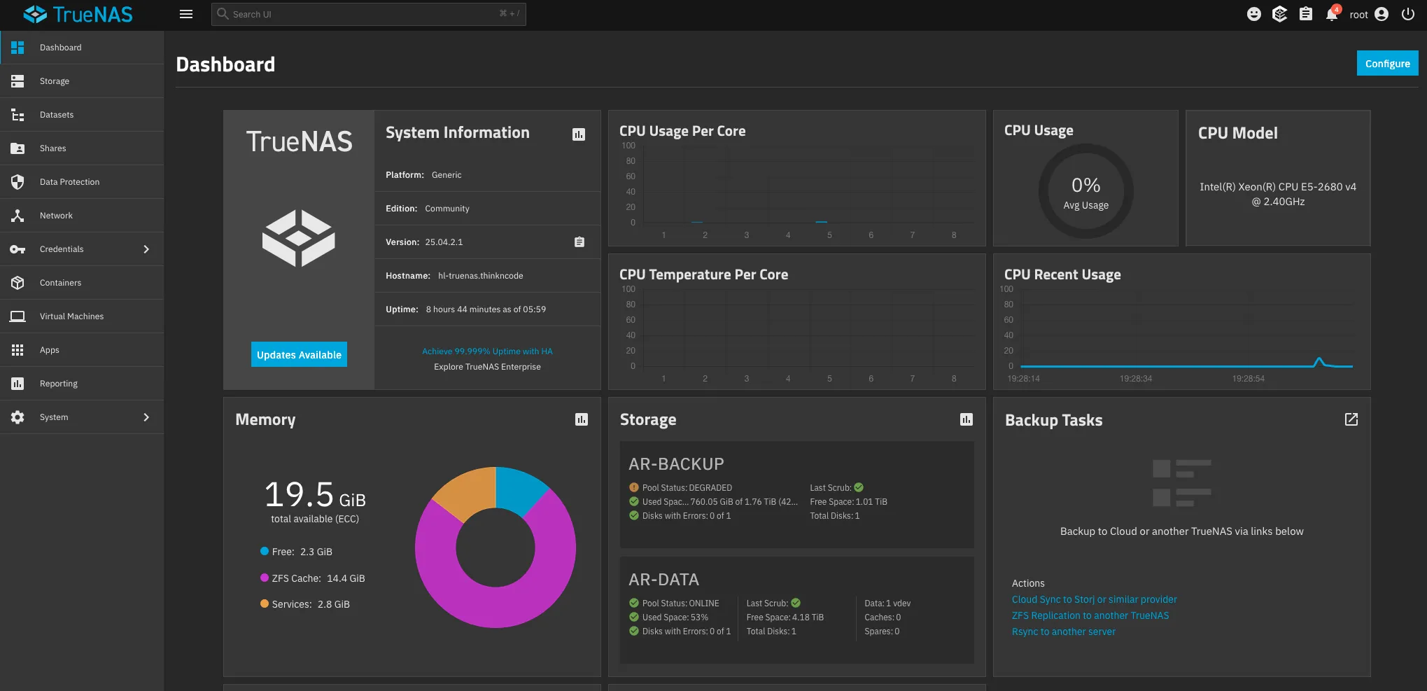 TrueNAS (running bare metal) is my other offsite backup target, primarily used for ZFS-native replication. With 16GB of RAM, it’s well-suited for ZFS ARC and runs efficiently even under replication load.