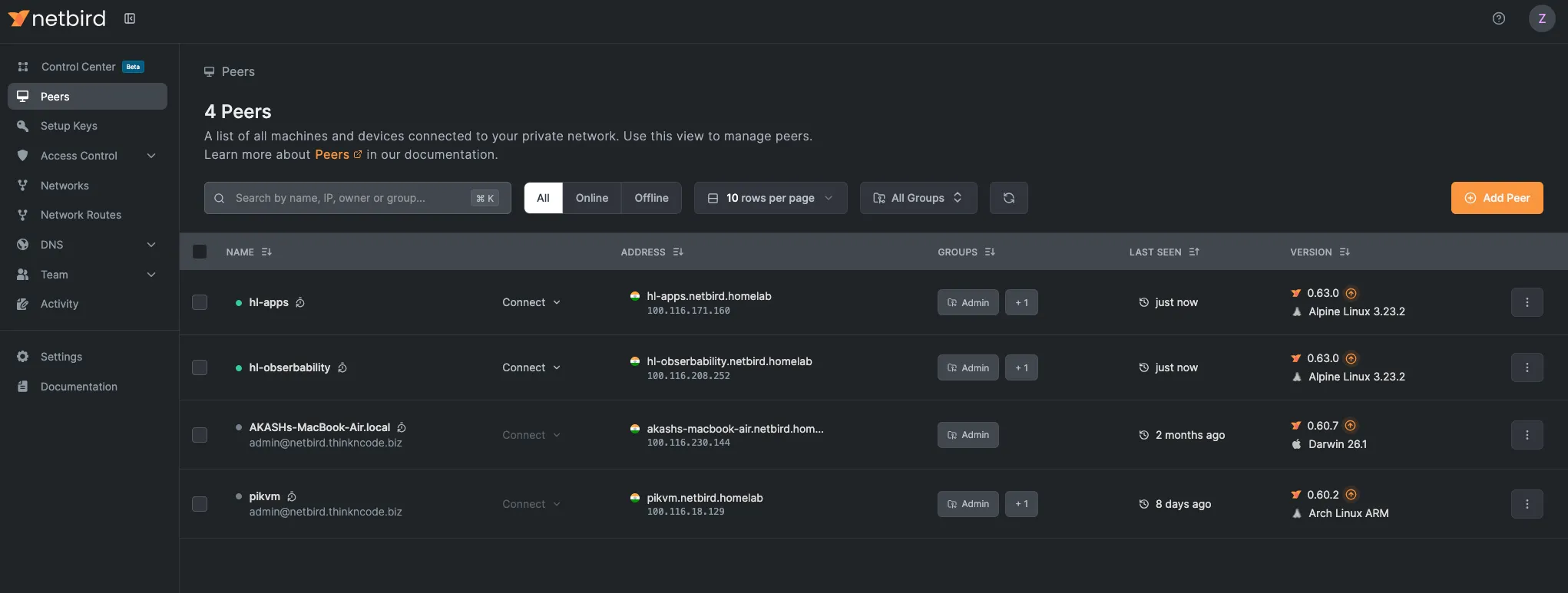 Netbird is a self-hosted, open-source WireGuard-based mesh VPN. Unlike the hub-and-spoke model, each device running the Netbird agent is a peer. The management server runs on a Hetzner VPS. pfSense runs the Netbird client and exposes the 10.0.5.0/24 homelab subnet, so any peer can reach homelab devices as if they were local, even if the home network is unreachable.