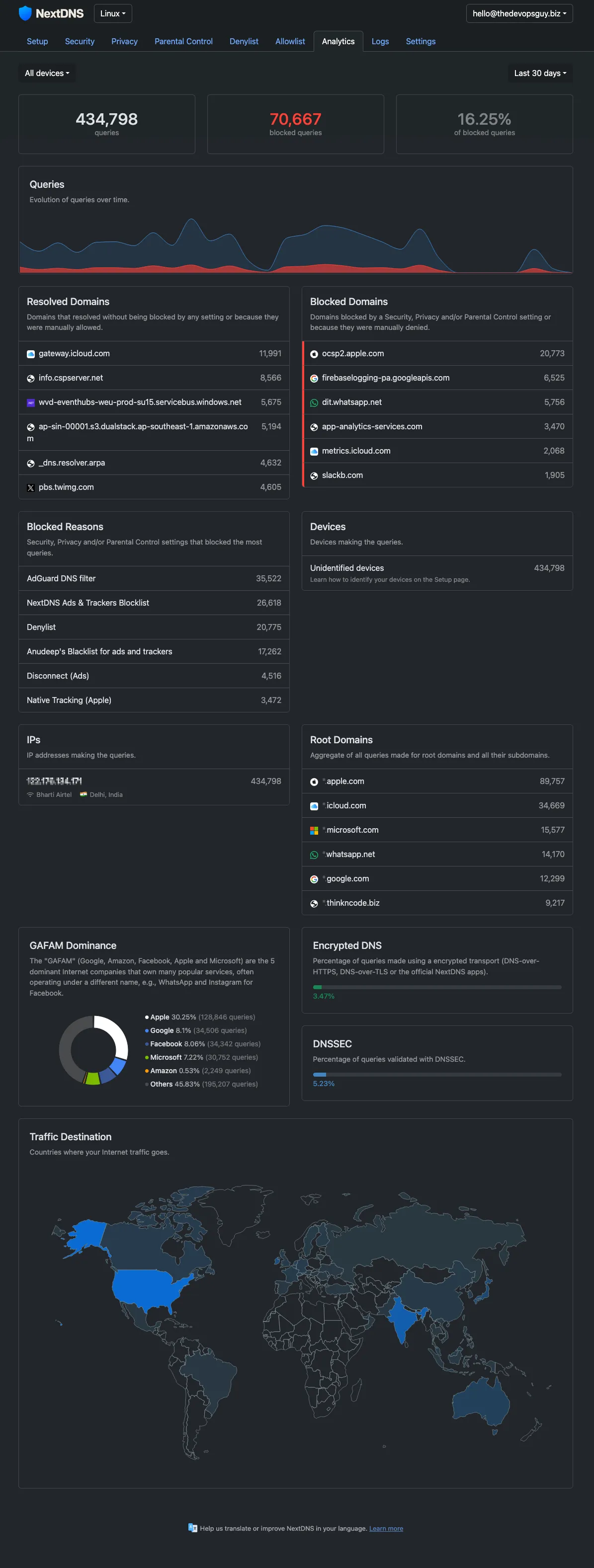 All DNS queries from every device on both segments flow through NextDNS, configured directly on the UDM SE. This gives network-wide filtering without managing a local resolver. Block lists, allow lists, and query logs are all managed in the NextDNS dashboard.