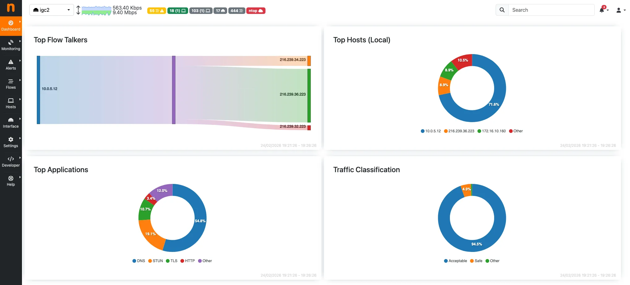 | ntopng | Real-time traffic analysis — top talkers, bandwidth per host, per service |