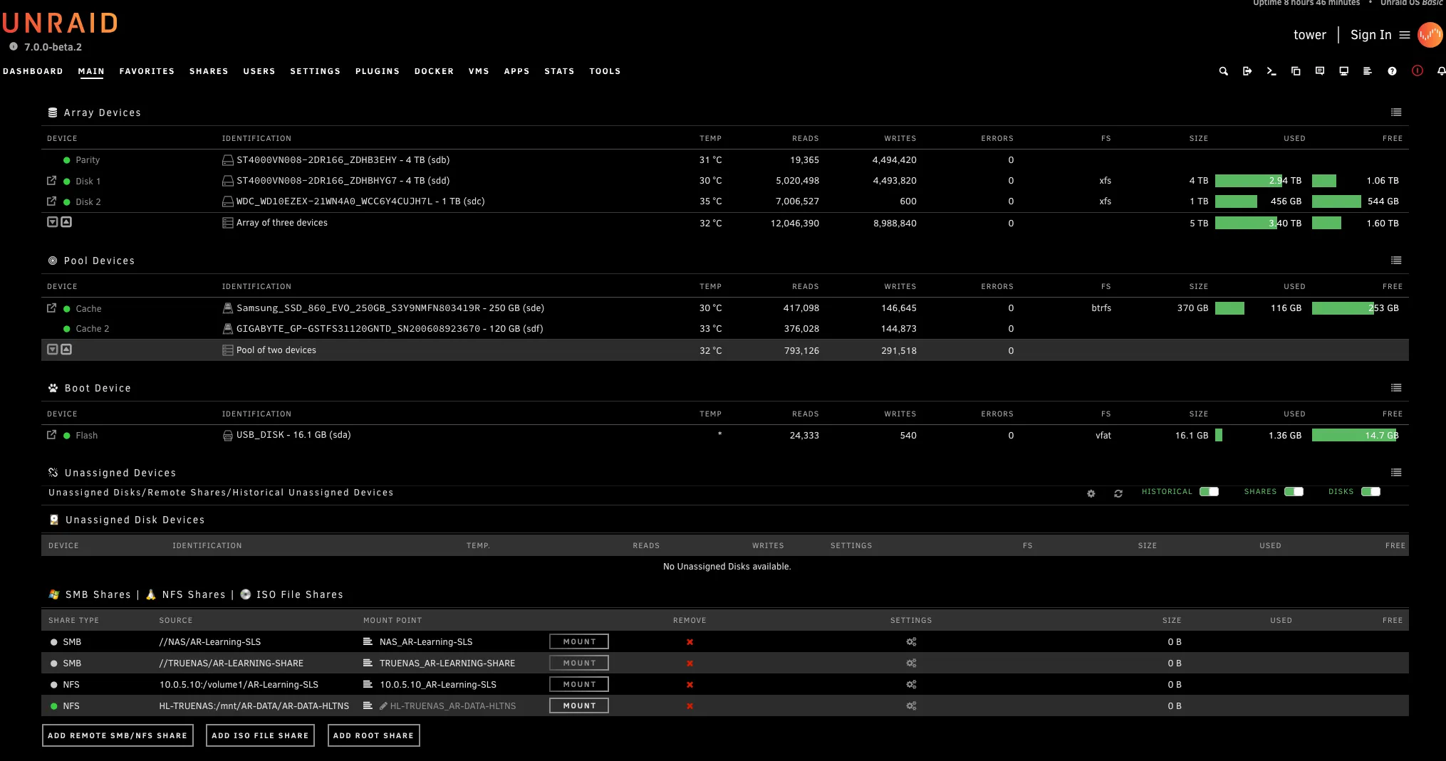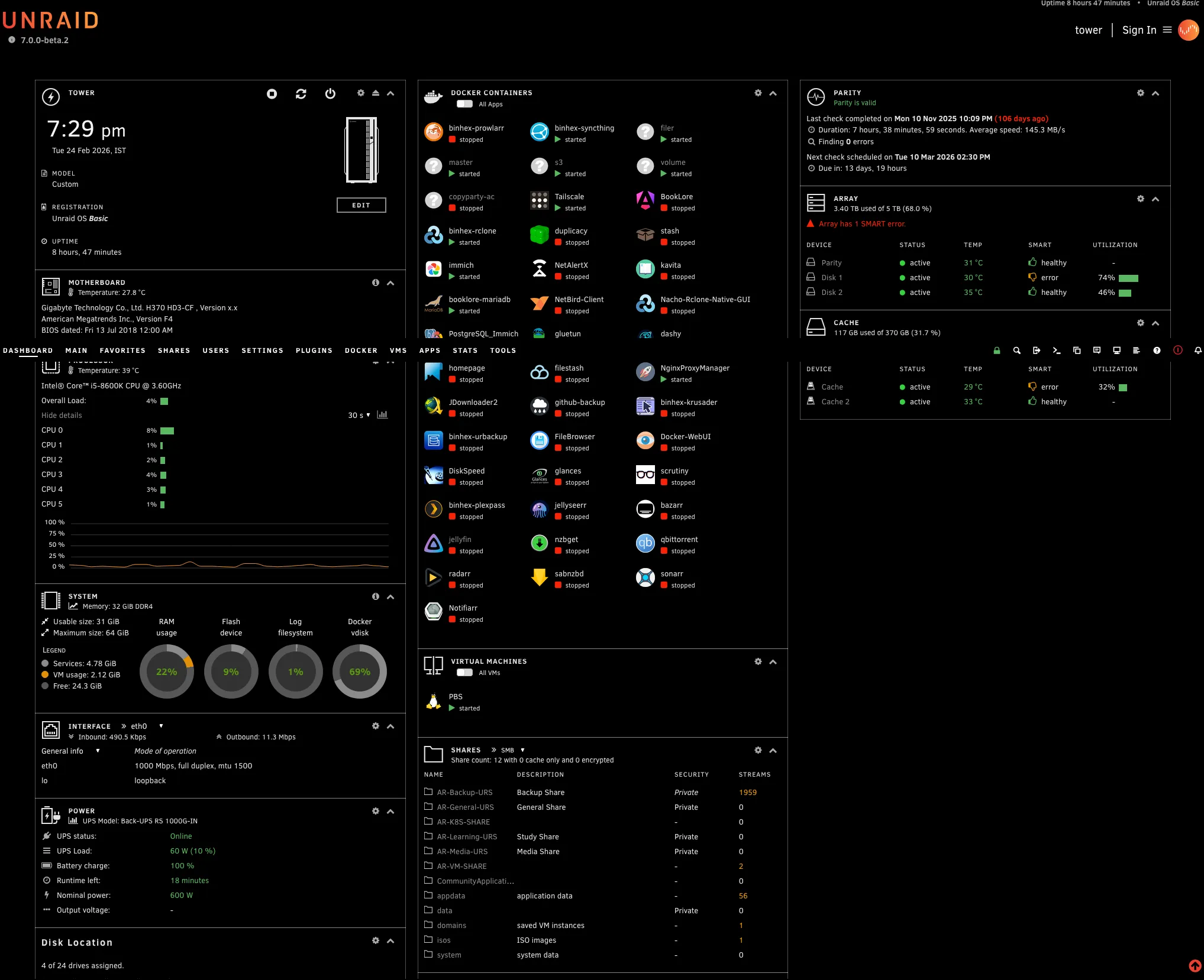Docker containers: Unraid also runs several containers through Community Apps, including Immich for photo management. I’ll cover the full list of running services in Part 2.