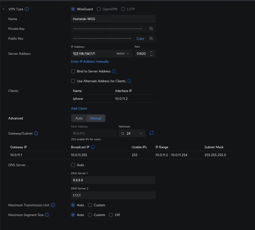 WireGuard on UDM SE covers quick remote access. When an external connection is needed, WireGuard is enabled on a phone or laptop, providing direct access to both the homelab and the client segment. This approach is fast and avoids external dependencies.